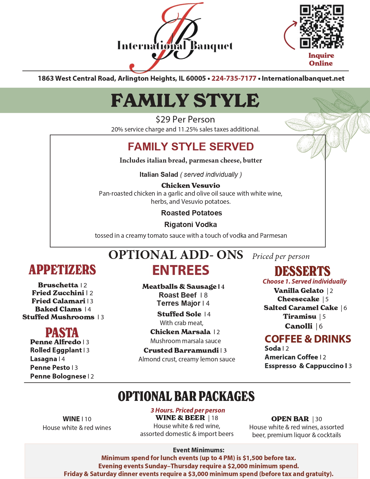 $29.00 Per Person | Minimum 50 People • Package includes bread, parmesan cheese, and butter.