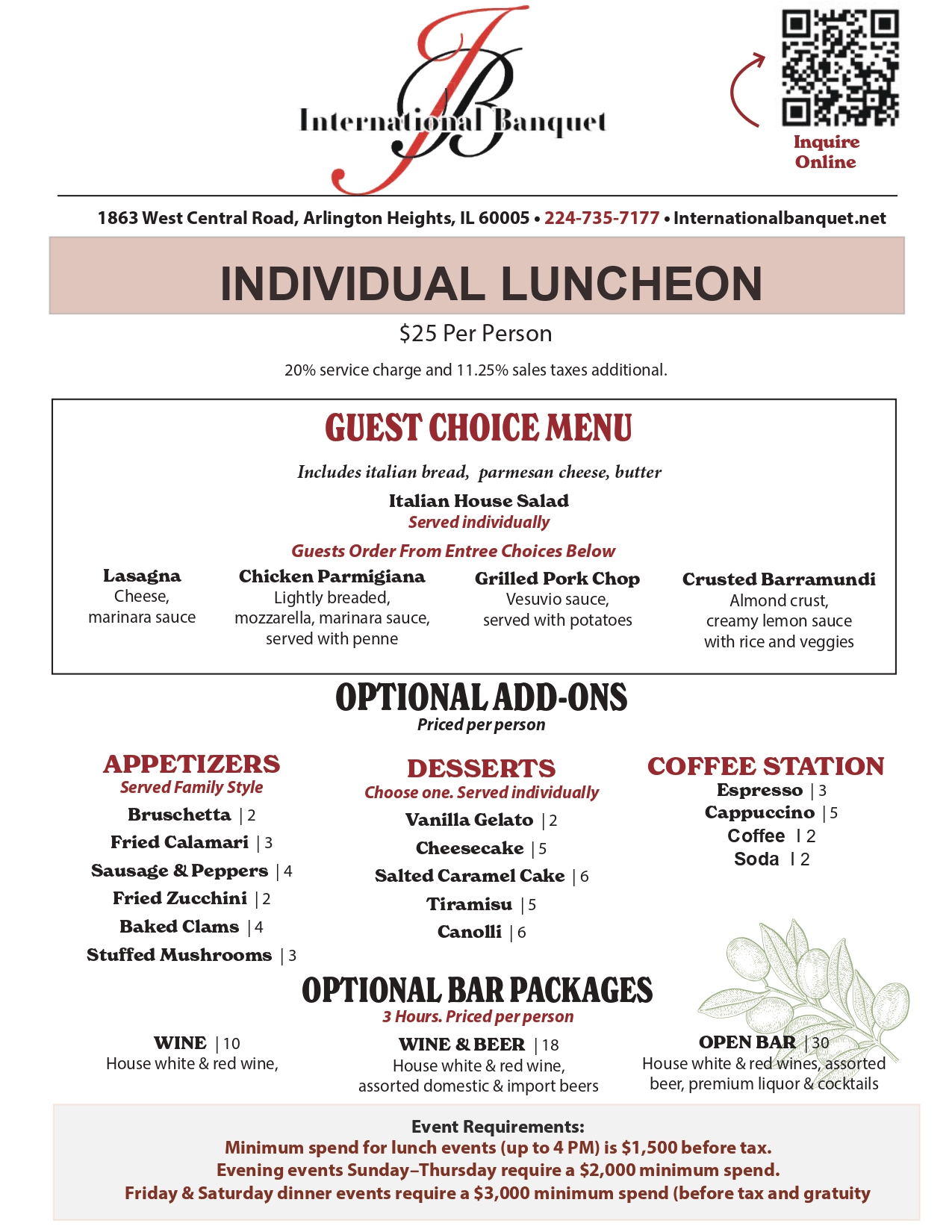 $25.00 Per Person | Minimum 50 People • 11:00 AM - 4:00 PM • Package includes bread, parmesan cheese, and butter